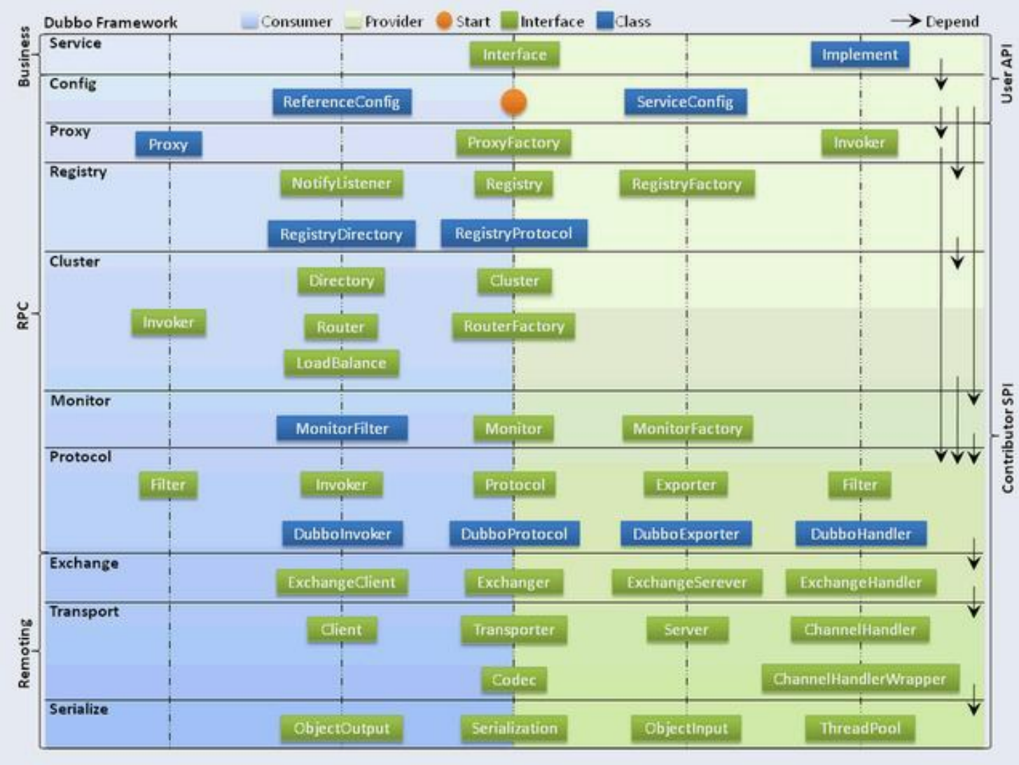 - 配置层(Config):对外配置接口,以 ServiceConfig 和 ReferenceConfig 为中心。