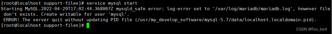 ERROR! The server quit without updating PID file (/usr/my_develop_software/mysql-5.7/data/localhost.localdomain.pid).