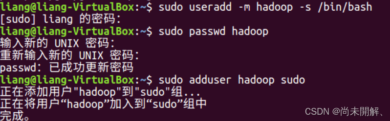 添加hadoop至管理员权限 sudo adduser hadoop sudo