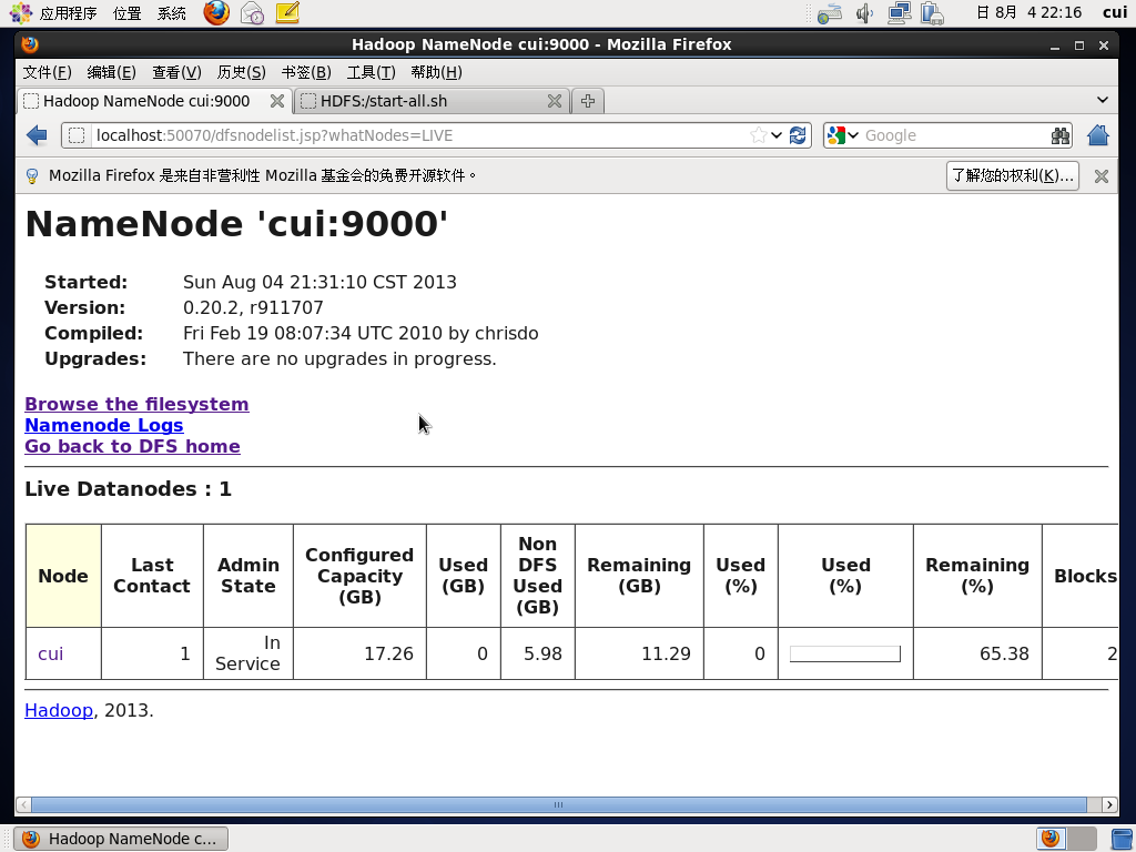 上图表示,活动的节点为1个。 (Live Datanodes:1) 至此可以确定HDFS已经正常启动了。