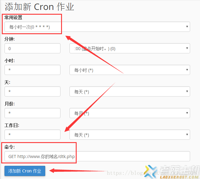 进入定时任务(Cron作业)页面,常用设置选择每小时一次(执行太频繁会消耗主机资源),命令填写: