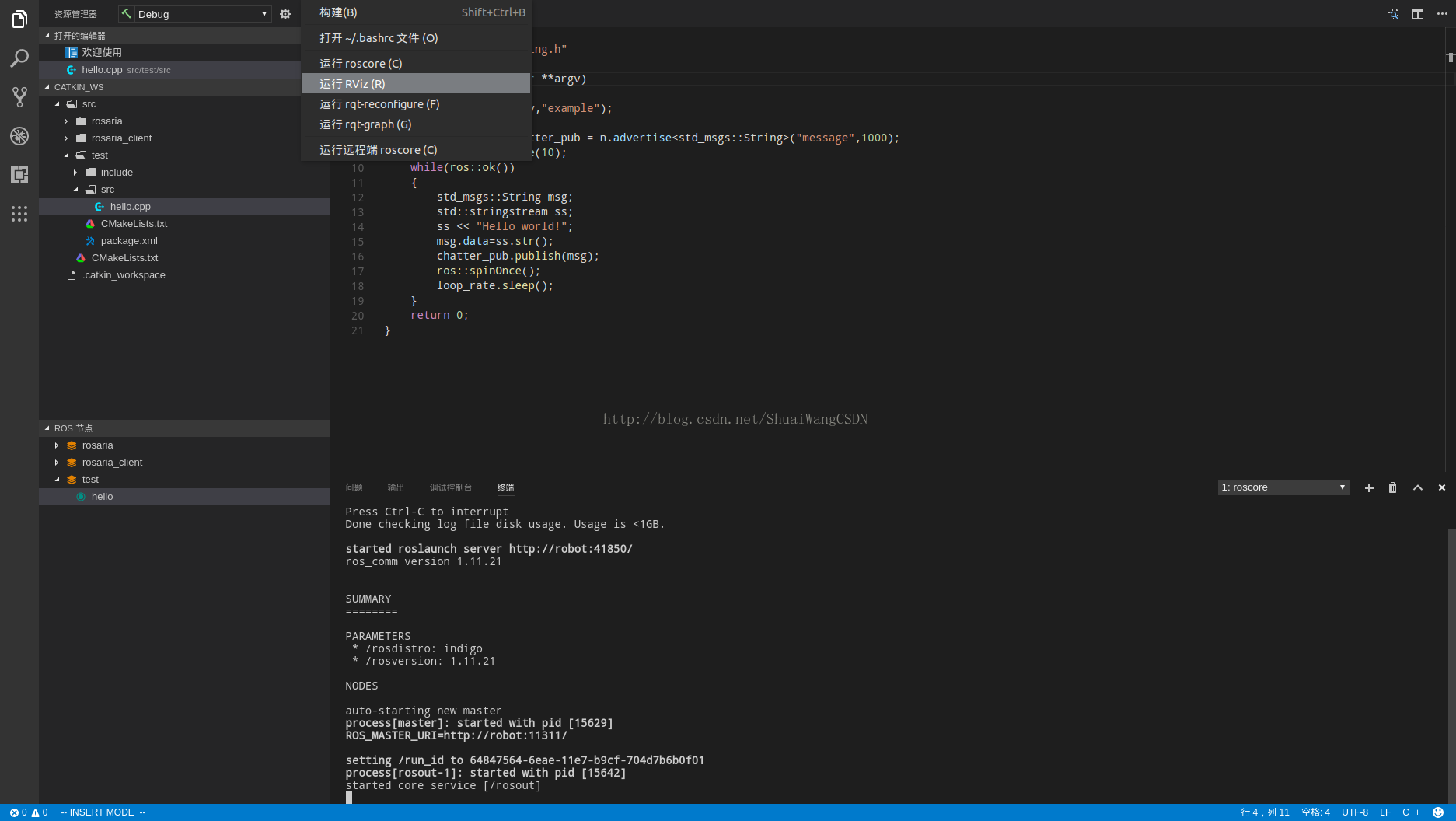 } 5. 点击左上角的锤子运行选定构建任务或者ctrl+shift+B,进行编译; 6. 点击上方菜单栏ROS(最大化后才能看到菜单栏),运行roscore,当然你要在终端中运行也是可以的; 然后在下方出现的终端中,点击右侧的加号新开一个终端, 运行 rosrun test hello