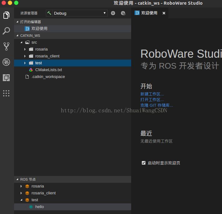 1. 安装后打开roboware,选择新建工作区或打开原有的工作区,因系统内已有之前建立的工作空间,且已配置好环境,故此处直接打开catkin_ws即可,打开后如下图所示,可见,使用IDE相比直接在终端下编程,文件的组织结构一目了然,并且可以免去编译时更新CMakeLists.txt 等操作,确实方便了很多。