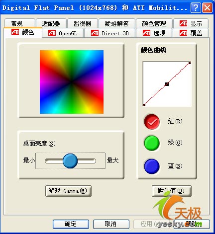 通过往ATI显卡的颜色曲线中添加或删除颜色校正控制点,可以达到精确控制显示器显示色彩的目的。在对显卡的颜色校正控制点进行编辑时,可以先用鼠标右键单击一下系统桌面的空白区域,从随后出现的右键菜单中执行“属性”命令,打开系统的显示属性设置界面;单击该界面中的“设置”标签,再单击对应标签页面中的“高级”按钮,打开高级显示属性设置窗口,接下来单击“ATI颜色”选项卡,打开如图1所示的颜色校正控制点编辑界面。