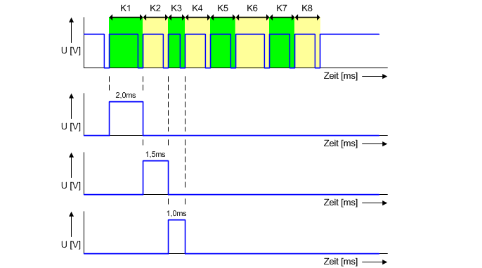 这样的一个脉冲通常用来控制一个通道,即一个舵机,如要控制多个舵机,则需要多个这样的通道,例如:我们要控制一架固定翼模型飞机,则我们至少需要四个通道来分别控制油门、副翼、升降舵、方向舵,各个通道的脉冲宽度控制各个舵机转动。