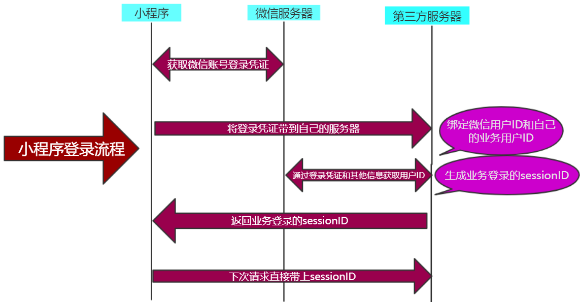 - 3步、苏宁服务器返回业务登录的 sessionlD 给到 苏宁小程序前端,下次请求直接带上 sessionlD ,就可以直接登录,不需要每次登录都需要在获取凭证了