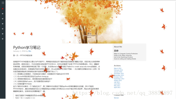 得意之处是简介大方的布局,目前市面上大多数的博客仍然停留在内容很多、样式繁琐,看起来眼花缭乱不清新的阶段,而我的博客主要设计理念就是清新、简洁、大方,让人耳目一新。并且加入了部分用户交互功能,用户可以评论和留言。