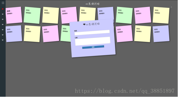 留言板页面由灰色背景作为墙的样式,将留言设计为便利贴的样式。