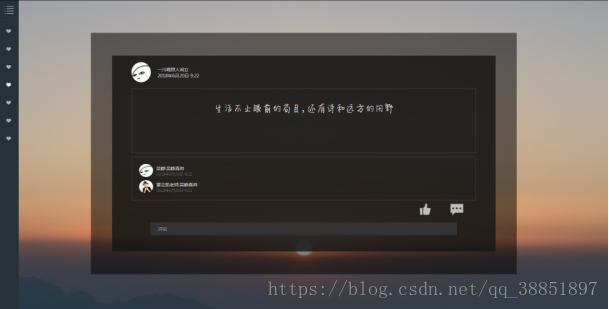 animation实现的可随鼠标移动有特效的高清风景图片,再在此背景上通过绝对定位将博主头像、昵称、和发表内容显示出来,在发表内容下为点赞和评论的图标,再下方为评论内容和复选框。通过javascript的creatElement(创建元素)和append(添加元素),创建元素后再将此元素的类名设为之前设好comment,通过选择器获得复选框内容和当前时间后再将DIV内容设为复选框中的内容,再将用户在复选框评论的内容移动到上方的评论内容中,这样就实现了用户评论功能,点击点赞图标后可以用alert弹出一条点赞成功的提示。