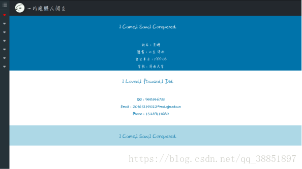 个人简介页面采用wordpress的简约风格,将个人信息分为三大部分,基本信息和联系方式,采用蓝、白、淡蓝的布局,此页面主要应用的效果有点击展开,再次点击收回特效和文字渐入特效,点击收回特效通过伪类选择器,当点击前div的高度为缩小时的高度,当触发伪类选择器后,将div的高度设为放大后的,再加上transition的时间,就实现了点击展开收回的效果。文字渐入效果则通过绝对定位将与背景色相同的DIV遮挡住文字,随着时间div向左移动,这样就使文字慢慢地显示出来。
