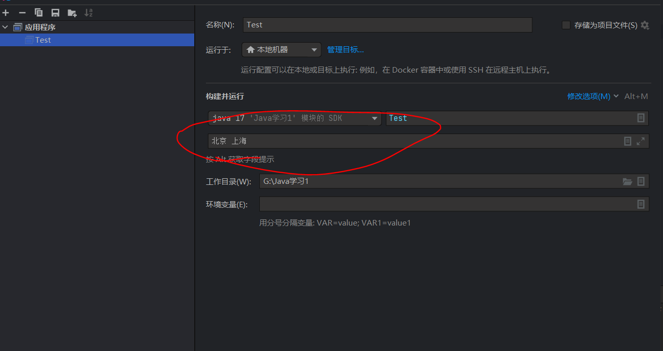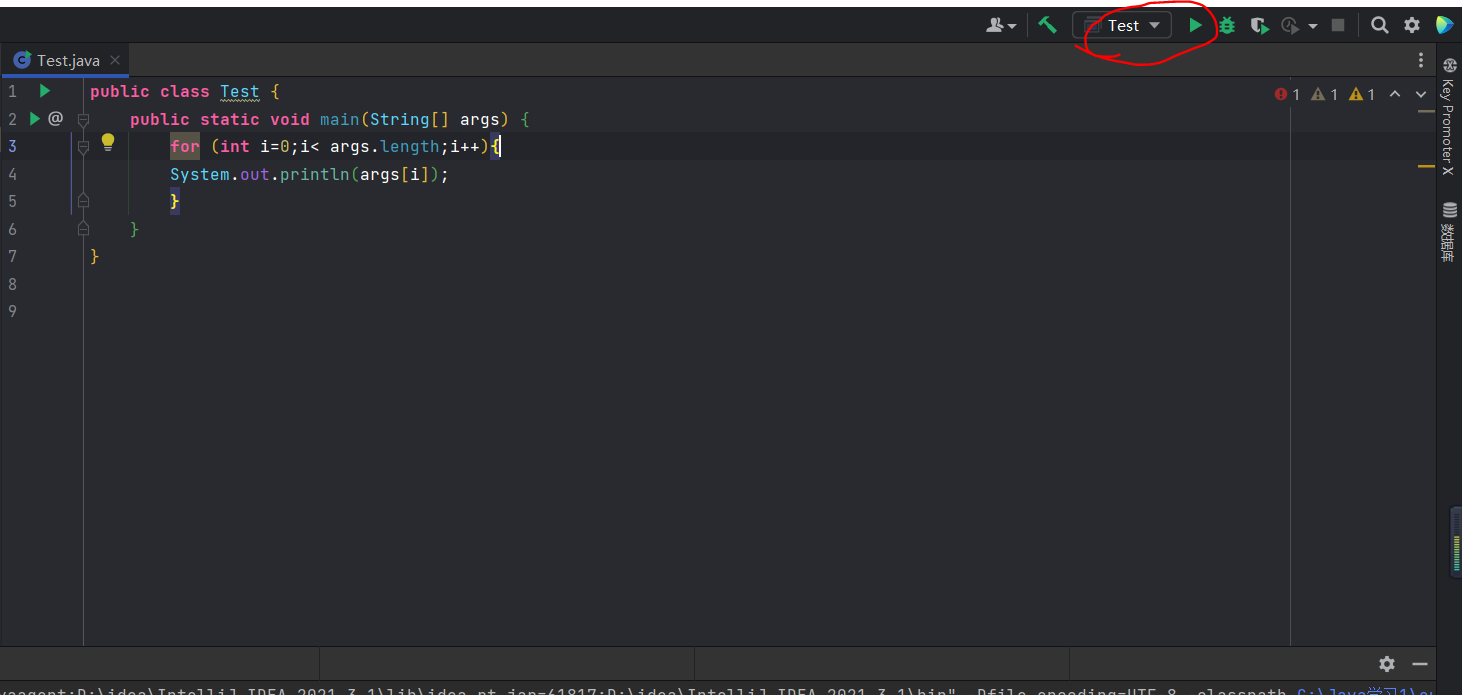 如果我们想要在idea中也这样输出,点击test这里的编辑配置,在实参输入哪里输入想要的就可以实现输出效果。