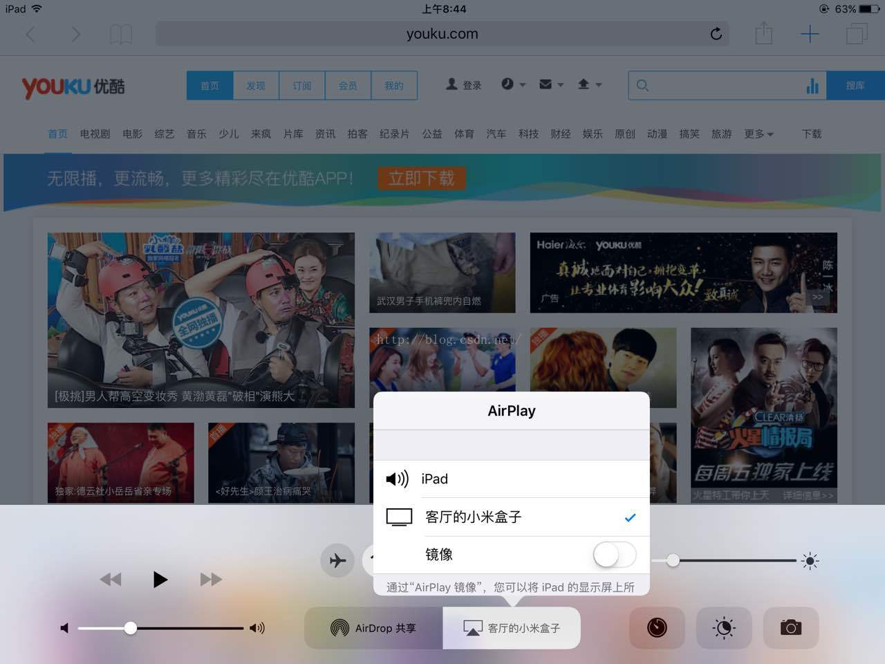 对于优酷、爱奇艺的手机客户端也一样,只要播了下视频,然后投滑出 AirPlay ,选择投小米盒子上就行了。不要开“镜像”它是把IPAD的屏幕显示到电视上,你可以试试就知道了。