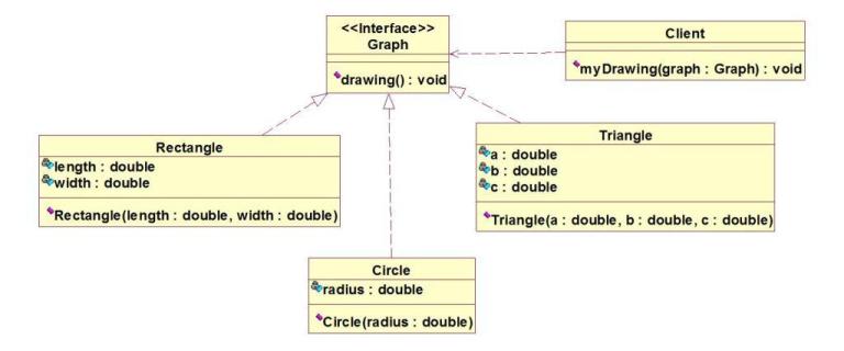 10.请根据如下类图设计Java程序。Graph接口中的drawing()表示绘制一个图形;Rectangle是矩形,Circle是圆,Triangle是三角形,客户端Client中的myDrawing()方法根据传入的Graph类型来绘制相应的图形。