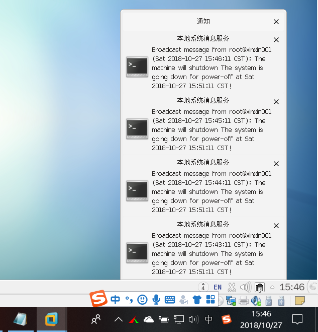 Broadcast message from root@xinxin001 (Sat 2018-10-27 15:18:00 CST):