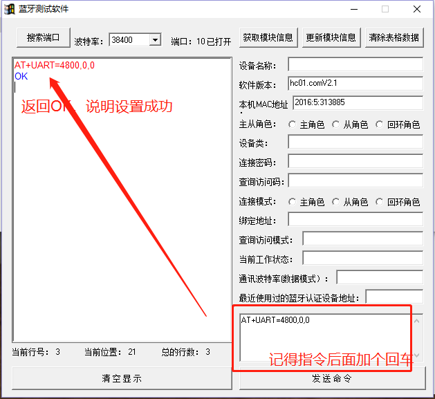 需要注意的是,1、在波特率要选择正确,此处是原始模式,所以是38400。2、AT命令后面需要换行,然后点发送命令才有效,如果没有换行,发送命令,软件只会把它们当作是字符。