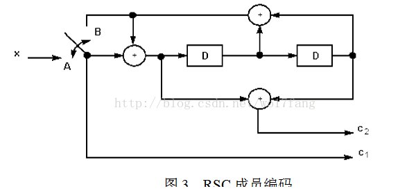 由于与非递归卷积码相比,递归卷积码产生的码字重量更大,所以这里采用了两个相同的系统递归卷积码(RSC)。信息序列分成相同的两路,第一路经过RSC编码器1,输出系统码及校验码。另一路先通过交织器进行交织,使信息序列在1帧内重新排列顺序,然后经过RSC编码器2得到系统码和对应的校验码,由于该系统码和实际上都是原信息序列,只是排列顺序不同,在接收端完全可以通过对进行交织得到,因此在传输过程中可以省去,而只保留对应的校验位。