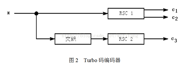 3GPP LTE协议中使用的Turbo码为1/3码率的并行级联码,它的编码器由两个相同的码率为1/2的RSC编码器及交织器组成,如图2所示。