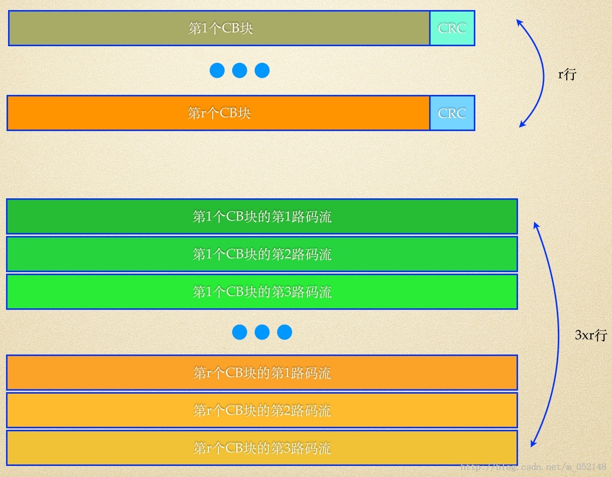LTE下行共享信道中的每个CB块,都会进行独立的Turbo编码过程,且输出3路比特流码块(即意味着总的编码速率是1/3)。这3路码流分别被称作系统比特、第一校验比特和第二校验比特。 r 个CB块比特码流经过信道编码之后,输出(3 * r)路比特流码块,如图2所示。