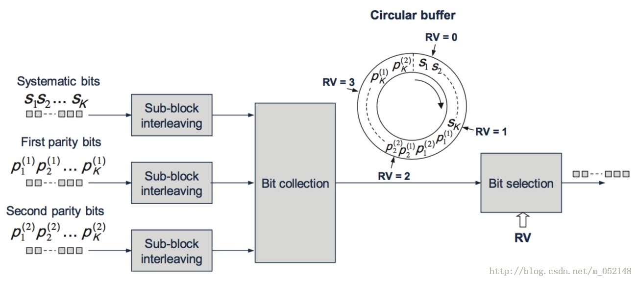 经过Turbo编码后,每个CB块被转换成的3路比特码流,即系统比特、第一校验比特、第二校验比特,将首先进行独立的子块交织(Sub-block interleaver)。然后,交织的比特将被插入到一个环形缓冲器中(virtual circular buffer),系统比特最先插入,然后是第一校验比特和第二校验比特交替插入,也就是图4中的比特收集(Bit collection)过程。