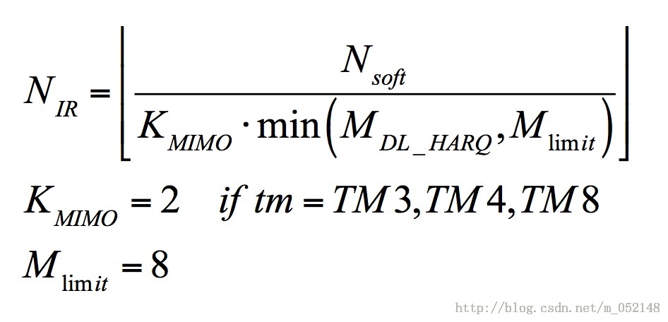 在协议标准里,用符号Nir来表示某个传输块的软缓存大小比特数(soft buffer size)。可以通过下面的公式1计算得到N_IR: