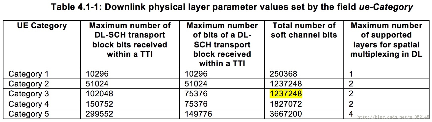 公式中的Nsoft由UE的能力决定,本例中UE能力为CAT3,所以Nsoft=1237248 bits。注意,这里很多人容易将“每个TTI内最多能调度的TBS”以及“每个TTI内每个TB块最多能传输的TBS”这两个概念与Nsoft相混淆。