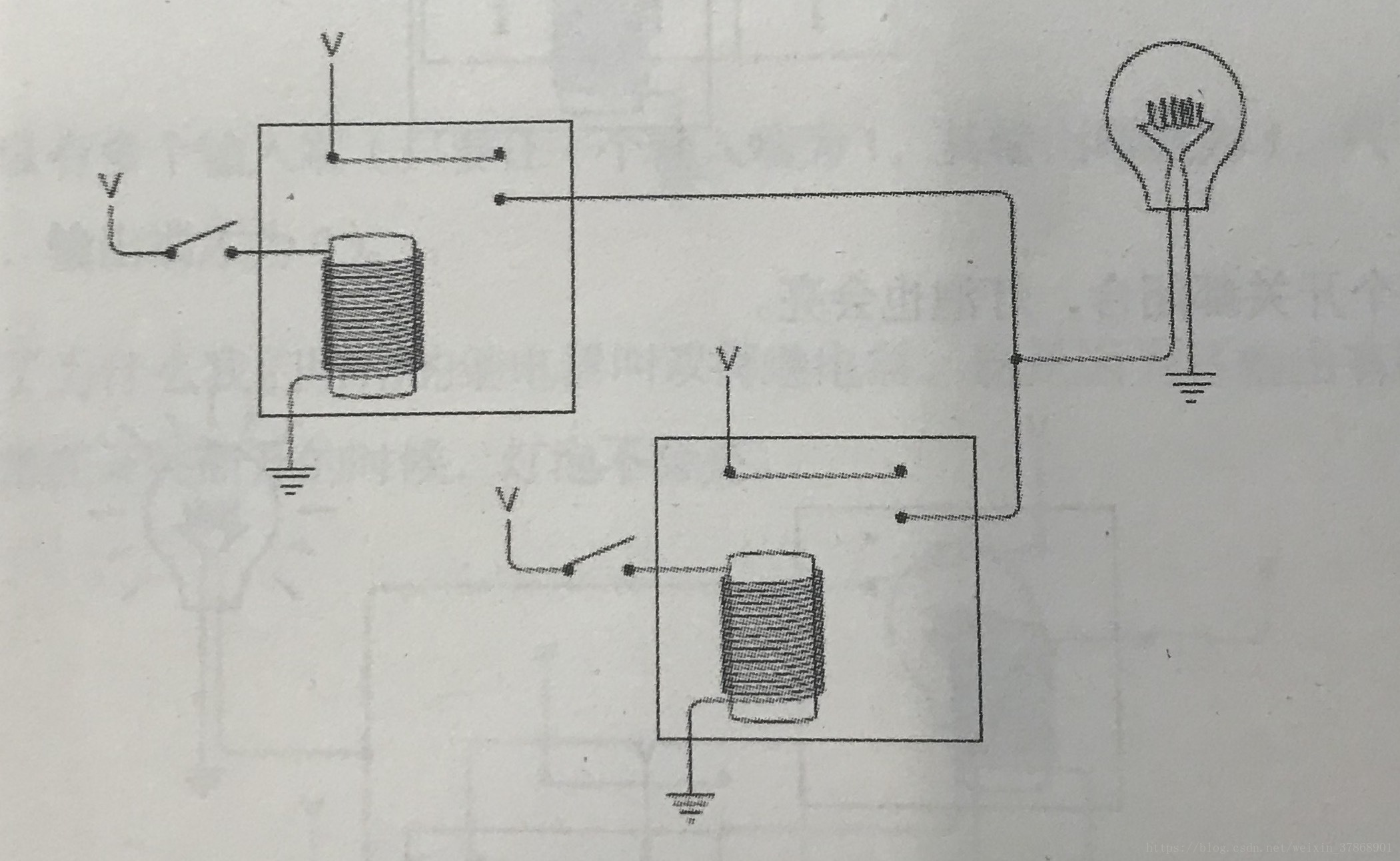 两个继电器右端电路的串联,当且仅当两个开关闭合,灯泡才亮。