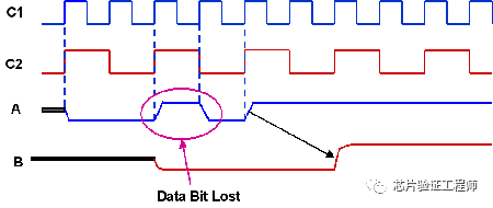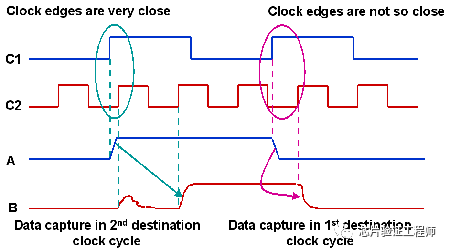 如果C1和C2的时钟边沿非常靠近,则在源数据A翻转之后的C2的第一个时钟边沿无法捕获它。该数据最终被时钟C2的第二个时钟边沿捕获,如下图所示。