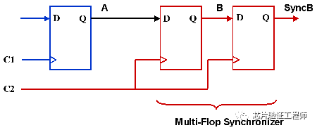 可以通过在目标域中添加同步器来避免亚稳态问题。同步器允许振荡在足够的时间稳定下来,并确保在目标时钟域获得稳定的输出。一个常用的同步器是一个级联触发器,如下图所示。