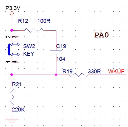 将按键电路与I/O引脚结构图连起来看,就清晰多了,当GPIO设置为上位输入时,上拉电阻与按键的330欧、220K欧串联,这时IO口所读到的电平就是330欧与220K欧电阻分压的总合,由于这两个电阻阻值过大,因引读出的电压大于逻辑'1'的阀值。OK问题找到了,于是将IO设置成下拉输入,问题就解决了。因此这里得出一个结论,IO口是上拉还是下拉要根据,IO口外部接的空闲电平有关,如按键不按下时是低电平,则应该设置为下拉输入。