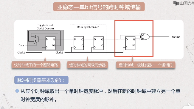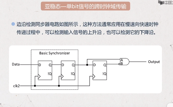 左边:两个同步的触发器,将其他时钟域信号同步到clock2的时钟域中。