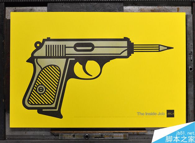 上面展现的案例,是我为创意论坛设计的一款名为 Inside Job(内在工作)的海报。我首先决定自己要设计一款铅笔/手枪的海报,之后我选择用单一的黑线与纯色背景让视觉元素(铅笔与手枪)结合。