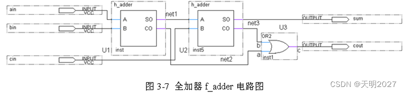 h_adder U2( .A (net1)),.so(sum),.B(cin),.co(net3)); //端口名关联法