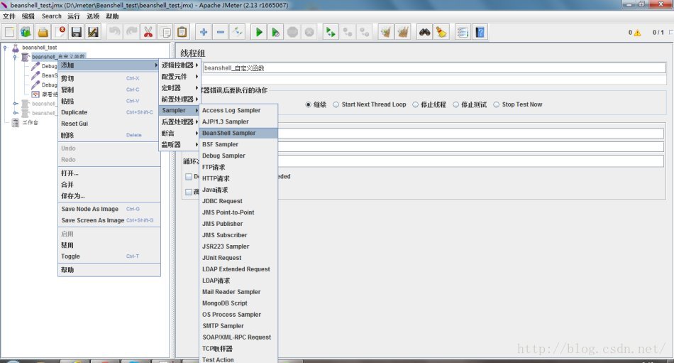 [ 图3:beanshell sampler的创建:右击线程组-->添加-->Sampler-->BeanShell Sampler ]