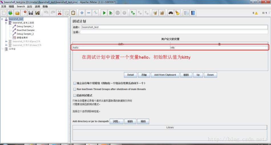 1. 创建测试计划,为了验证执行beanshell之后变量值的变量等,所以这里在测试计划里首先设置一个变量,并给出一个初始值,然后使用beanshell脚本去改变这个默认值,这样去验证beanshell脚本是起作用的。