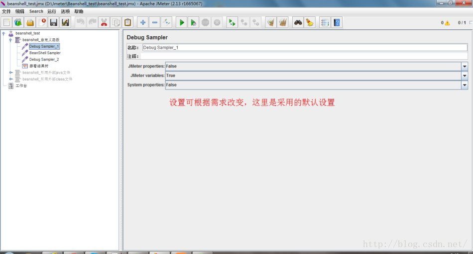 3、因为这里需要测试beanshell有没有起作用,所以在执行beanshell脚本之前和之后都添加一个debug Sampler,debug sampler添加完毕不需要设置什么,直接取默认就好。