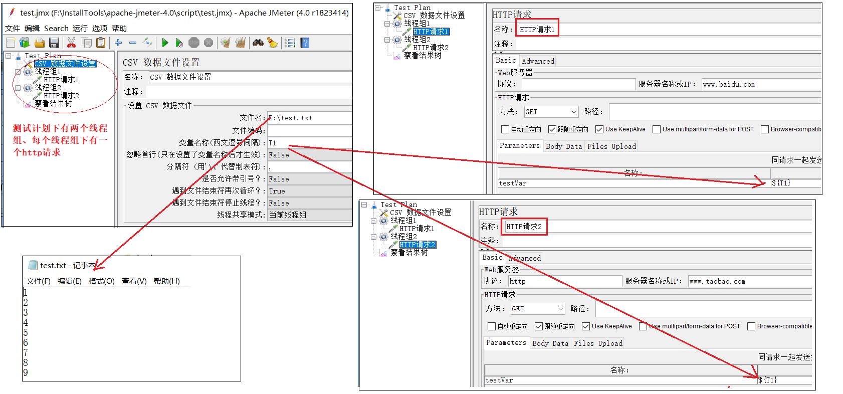 1)变量文件共享模式为所有线程组,变量文件中定义变量T1,值为1-9