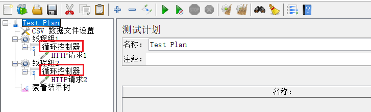 如下图,修改场景1脚本,将两个http请求分别放在循环控制器中,变量文件和http请求保持不变