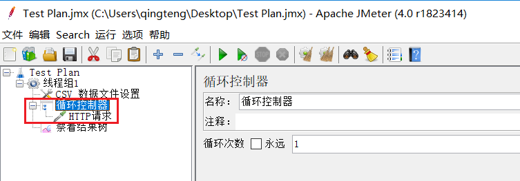 如下图,修改场景1脚本,将http请求放在循环控制器中,变量文件和http请求保持不变