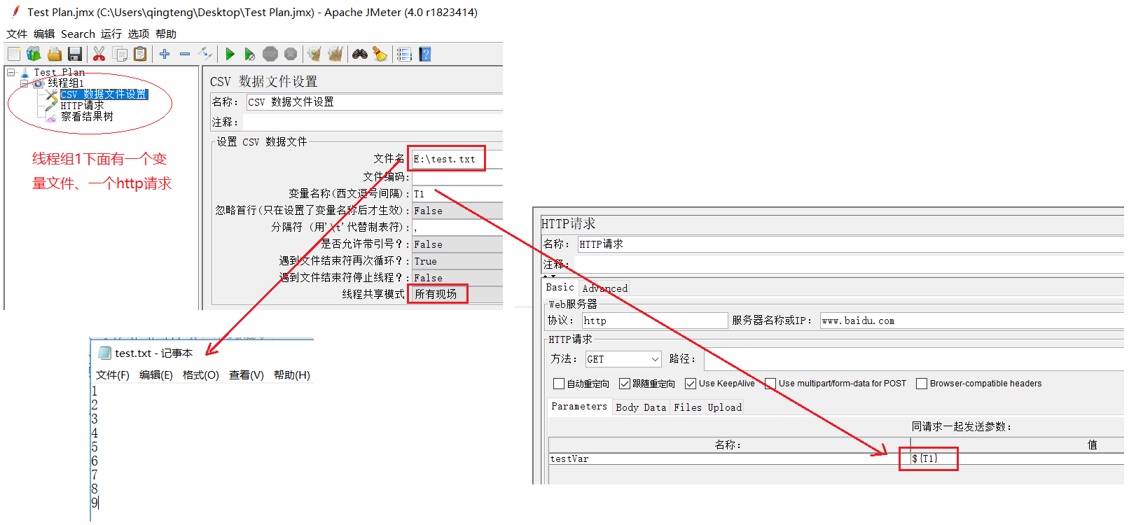 1)变量文件共享模式为当前线程,变量文件中定义变量T1,值为1-9
