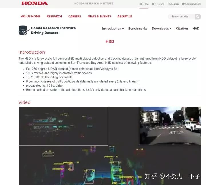 H3D - HRI-US(地址:https://usa.honda-ri.com/hdd/introduction/h3d) - 本田研究所于2019年3月发布其无人驾驶方向数据集,相关介绍于https://arxiv.org/abs/1903.01568介绍。本数据集使用3D LiDAR扫描仪收集的大型全环绕3D多目标检测和跟踪数据集。其包含160个拥挤且高度互动的交通场景,在27,721帧中共有100万个标记实例。凭借独特的数据集大小,丰富的注释和复杂的场景,H3D聚集在一起,以激发对全环绕3D多目标检测和跟踪的研究。
