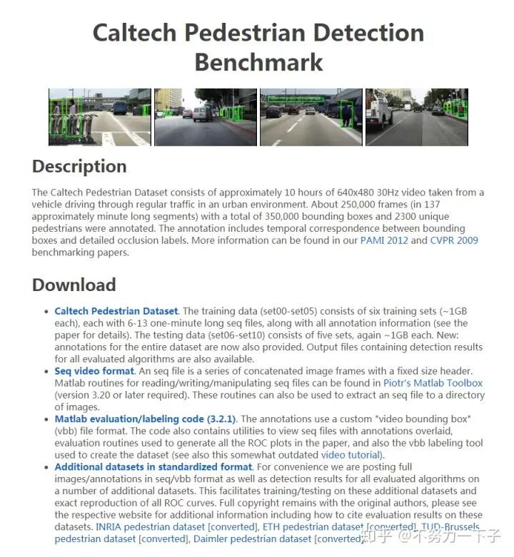 Caltech数据集(地址:http://www.vision.caltech.edu/Image_Datasets/CaltechPedestrians/) - 加州理工学院行人数据集包括大约10小时的640x480 30Hz视频,这些视频来自在城市环境中通过常规交通的车辆。大约250,000个帧(137个近似分钟的长段)共有350,000个边界框和2300个独特的行人被注释。注释包括边界框和详细遮挡标签之间的时间对应。更多信息可以在我们的PAMI 2012和CVPR 2009基准测试文件中找到。
