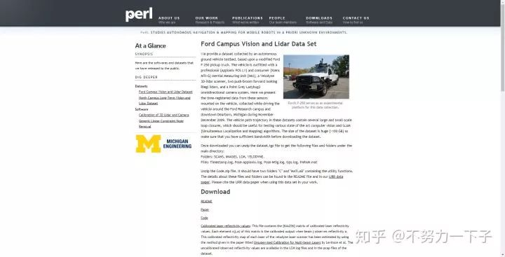 University of Michigan Ford Campus Vision and Lidar Data Set(地址:http://robots.engin.umich.edu/SoftwareData/Ford) - 基于改进的福特F-250皮卡车的自动地面车辆测试台收集的数据集。该车配备了专业(Applanix POS LV)和消费者(Xsens MTI-G)惯性测量单元(IMU),Velodyne 3D激光雷达扫描仪,两个推扫式前视Riegl激光雷达和Point Grey Ladybug3全方位摄像头 系统。