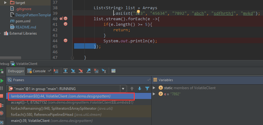 - 不管你遍历到哪个集合中的元素,上图都会停在第一行程序中而不会发生跳转,所以是不会停止lambda表达式的执行的。