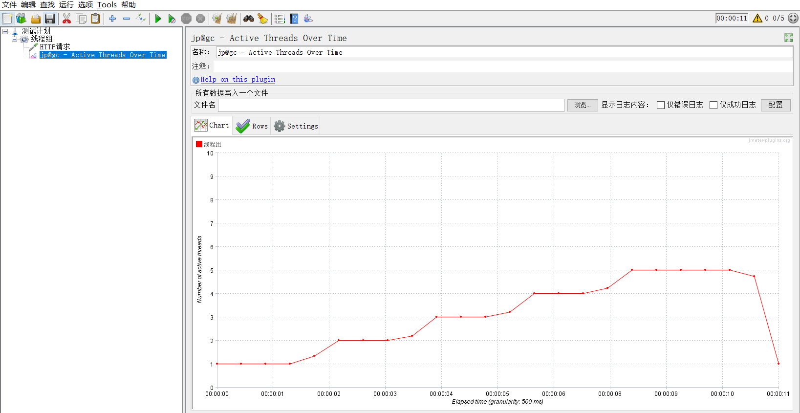 线程组设置:5线程,Ramp-Up设置为10