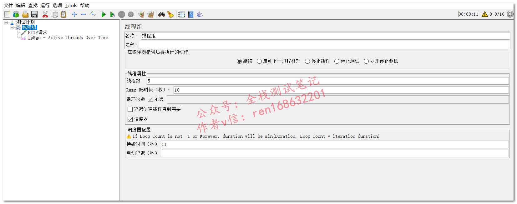 线程组设置:10线程,Ramp-Up设置为10