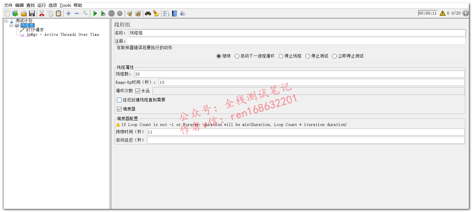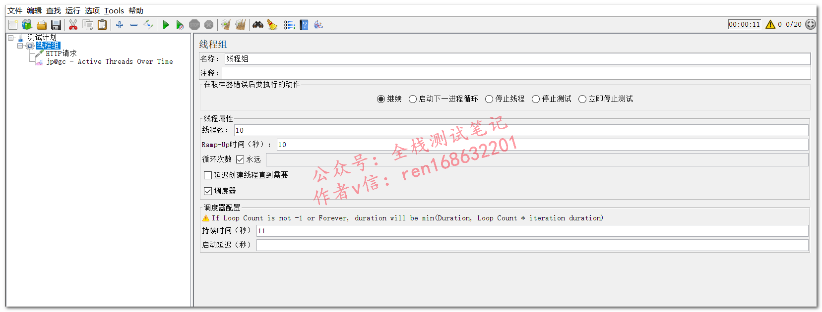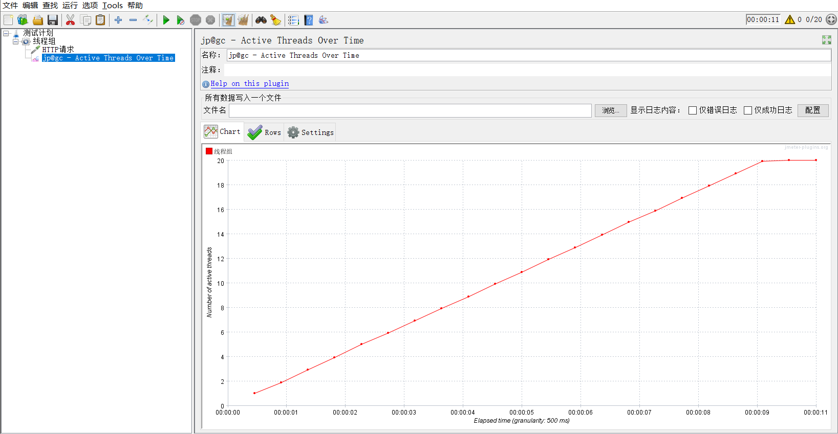 线程组设置:20线程,Ramp-Up设置为10