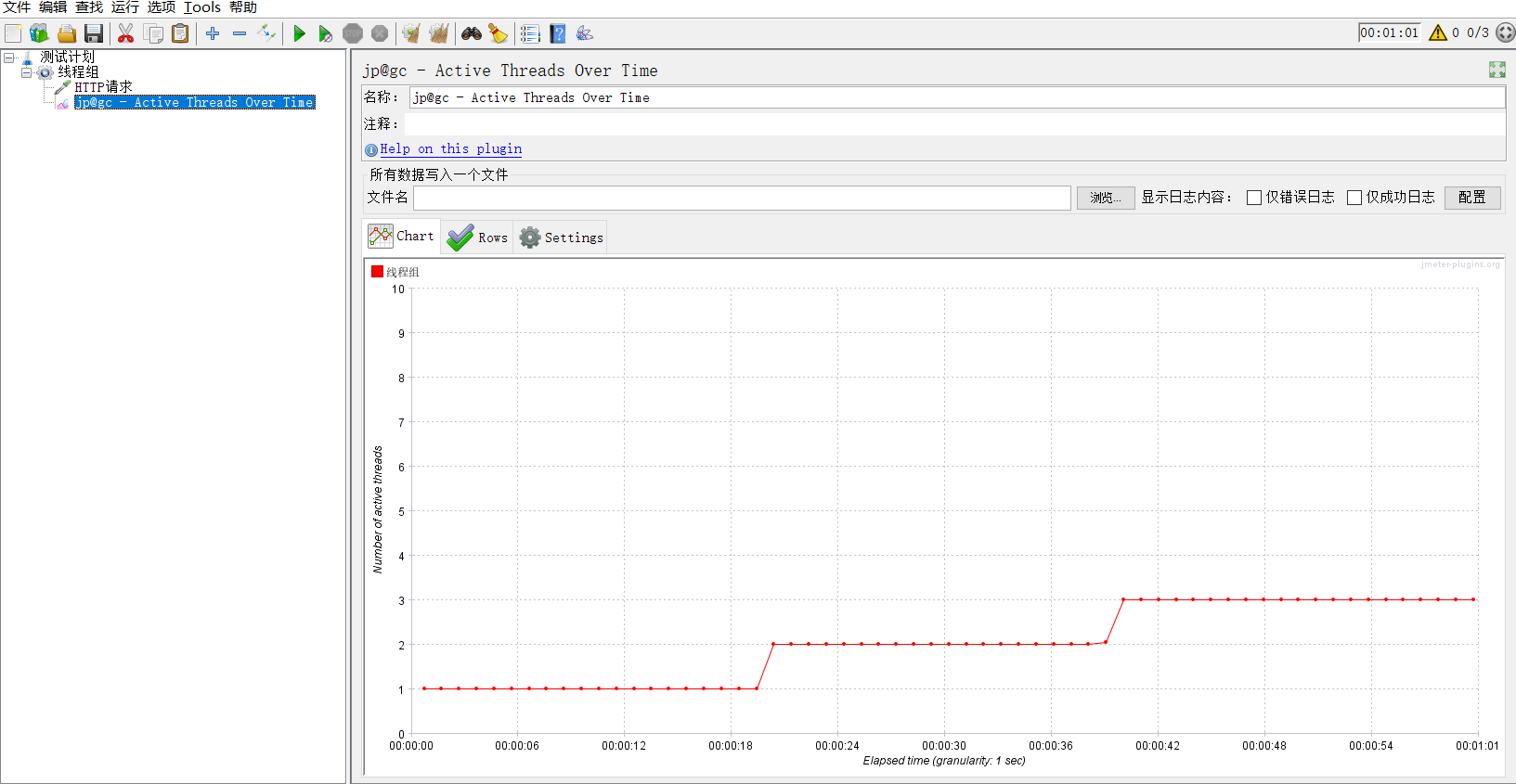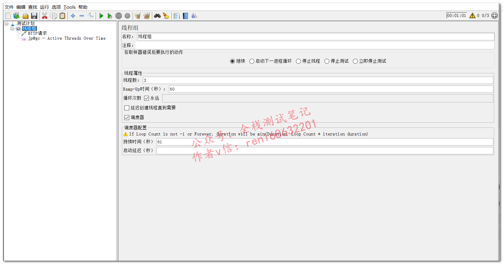 线程组设置:3线程,Ramp-Up设置为60