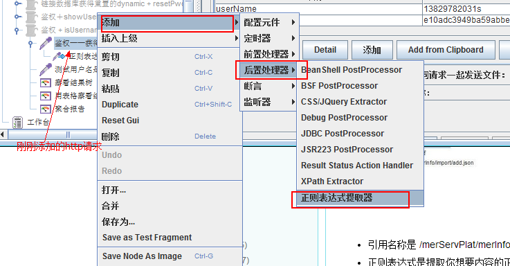 JMeter GUI 视图中右击该采样器打开右键菜单 -> 添加 -> 后置处理器 -> 正则表达式提取器,打开"正则表达式提取器"会话页面并编辑其内容如下: