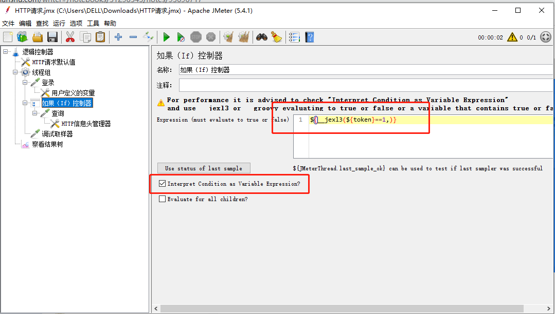 (1)interpret condition as variable expression:勾选上需要用jexl函数或groovy函数,不勾选则可以直接写表达式,注(表达式中的数据类型是字符串)