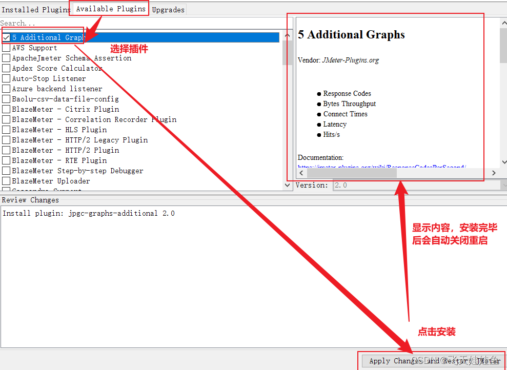 注意:如果此路径下没有Concurrency Thread Group,则先在Plugins Manager中plugins manager->available plugins->搜索Custom Thread Groups插件->勾选->点击Apply Changes and Restart Jmeter 安装插件;